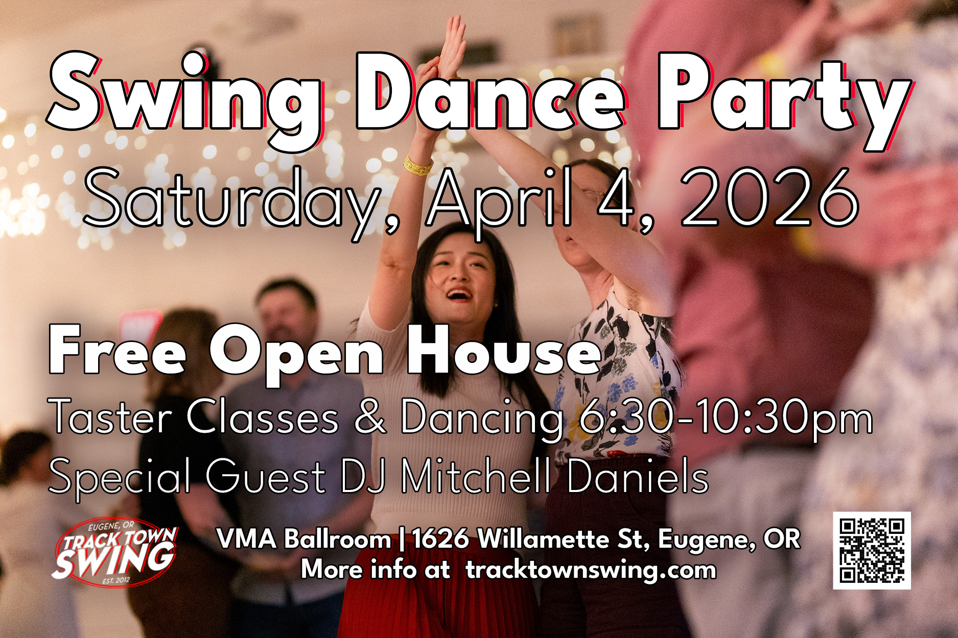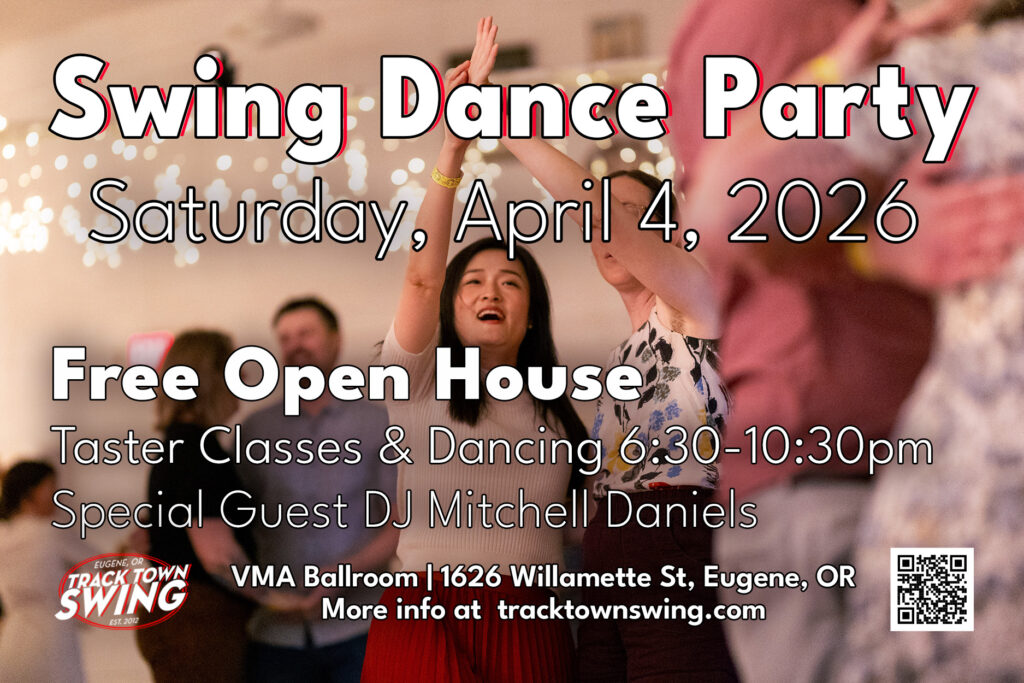 Please join us for our OPEN HOUSE event. We will be hosting a FREE Swing Dance Party with taster lessons from Track Town Swing Instructors and Guest DJ Mitchell Daniels from Portland!